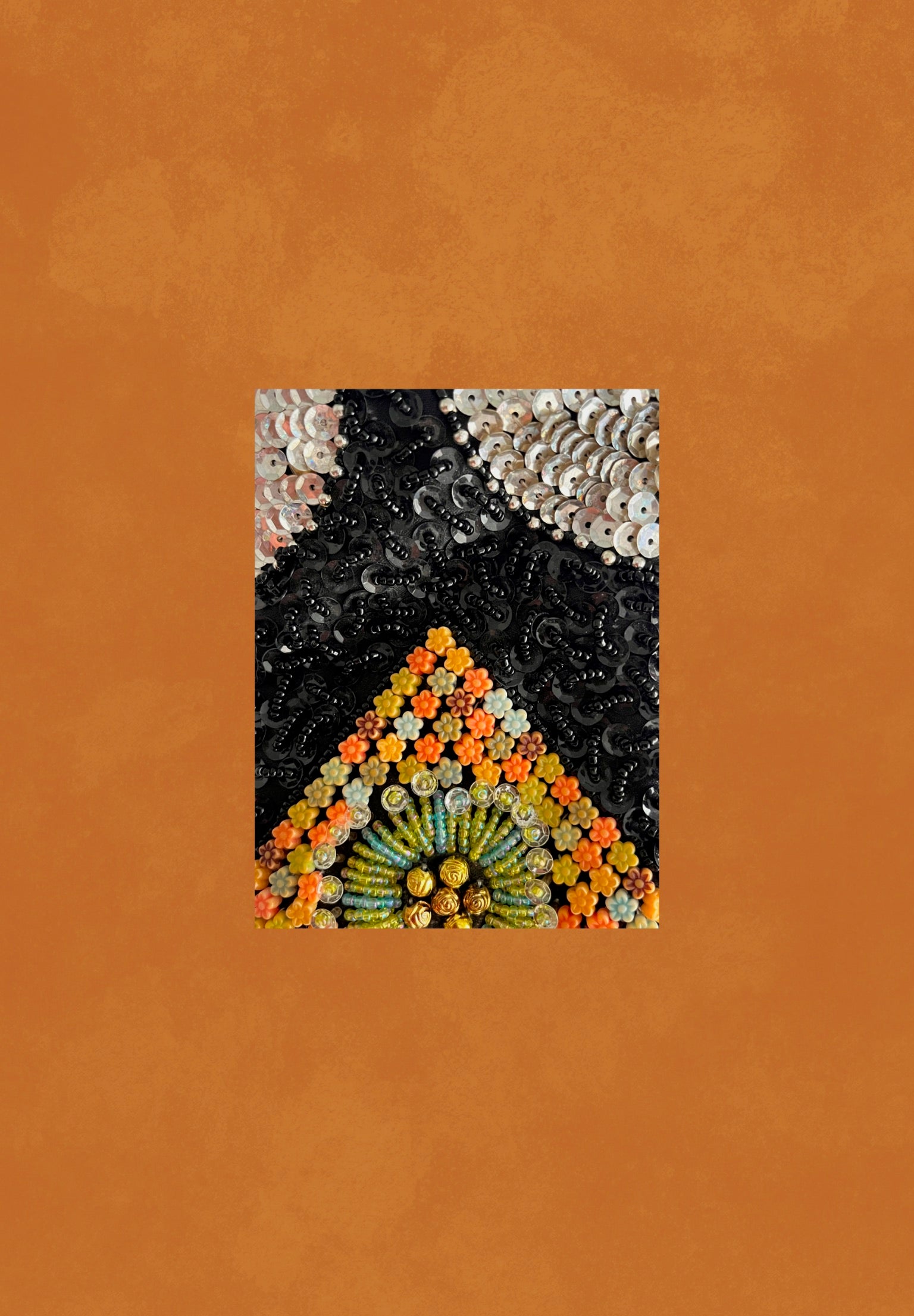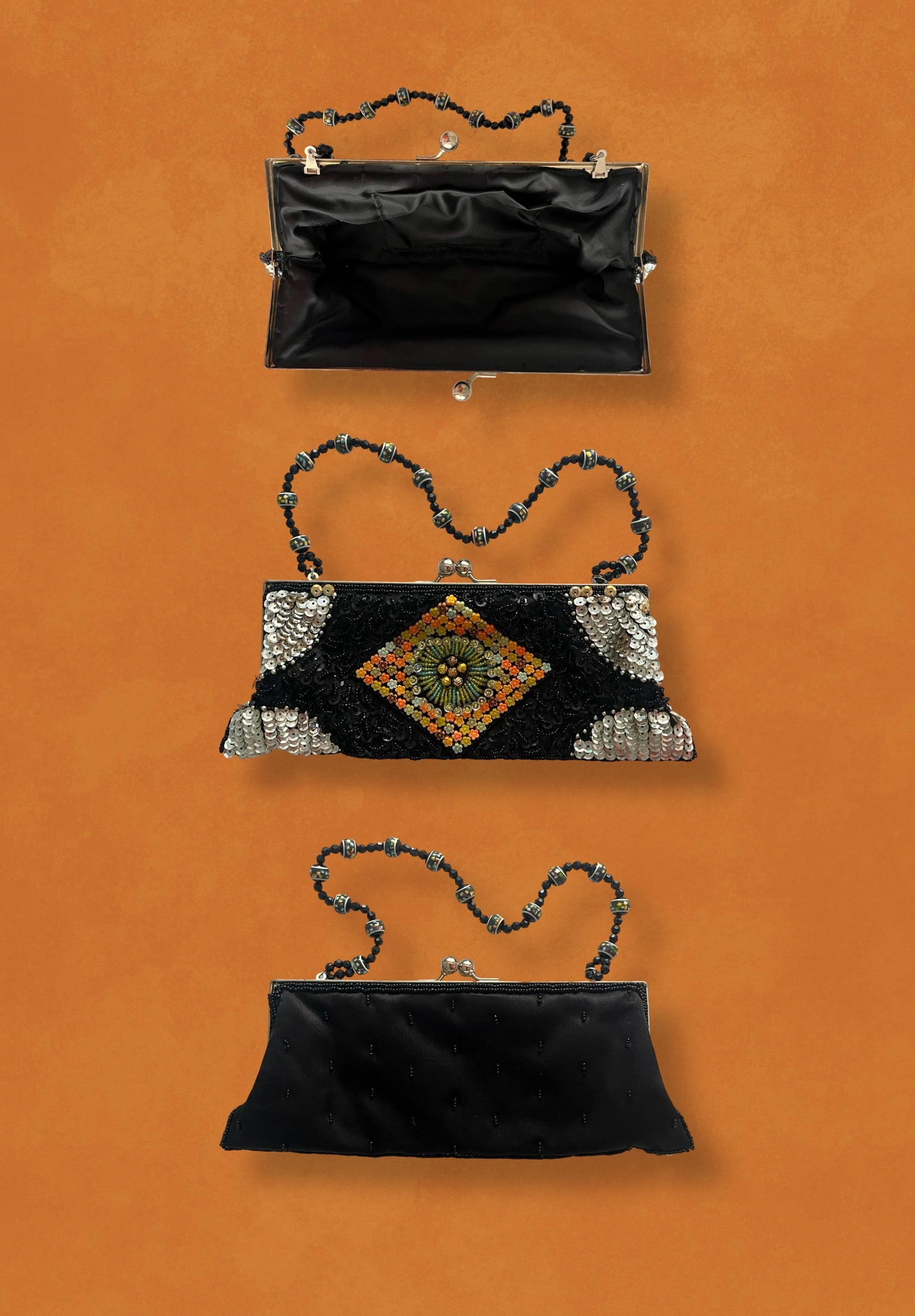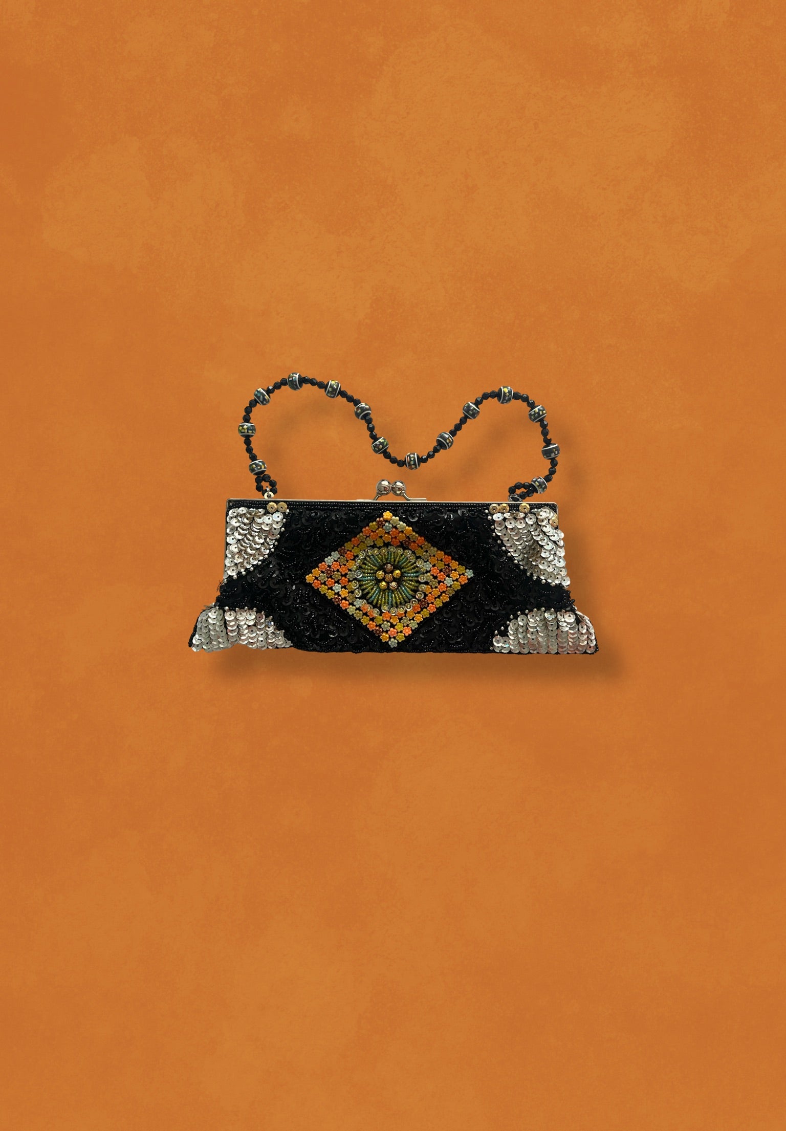 Bolso vintage decorado con lentejuelas en negro y plata, con un rombo central de piedras florales en tonos naranjas y verdes.Presenta un marco metálico en acabado plateado.