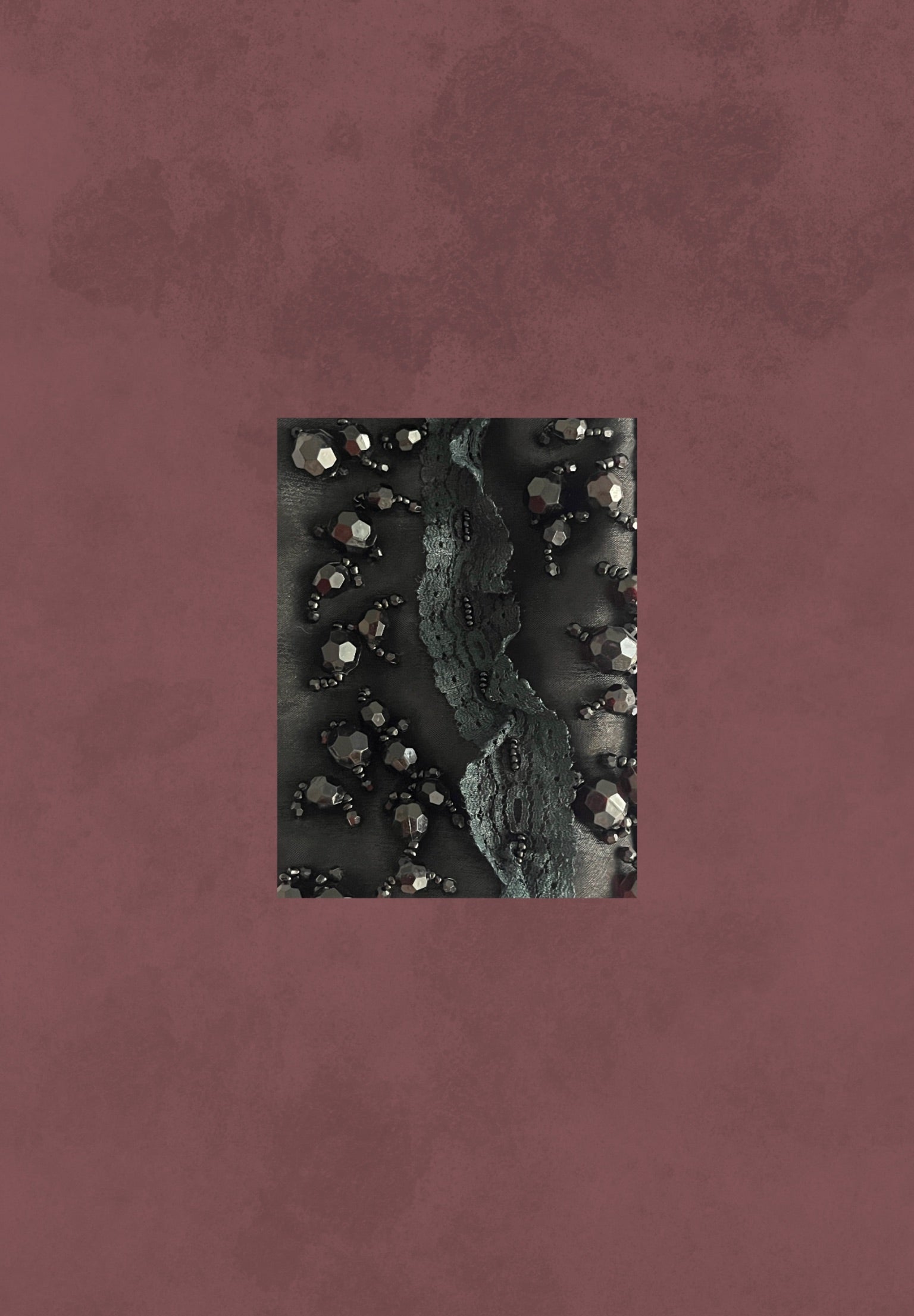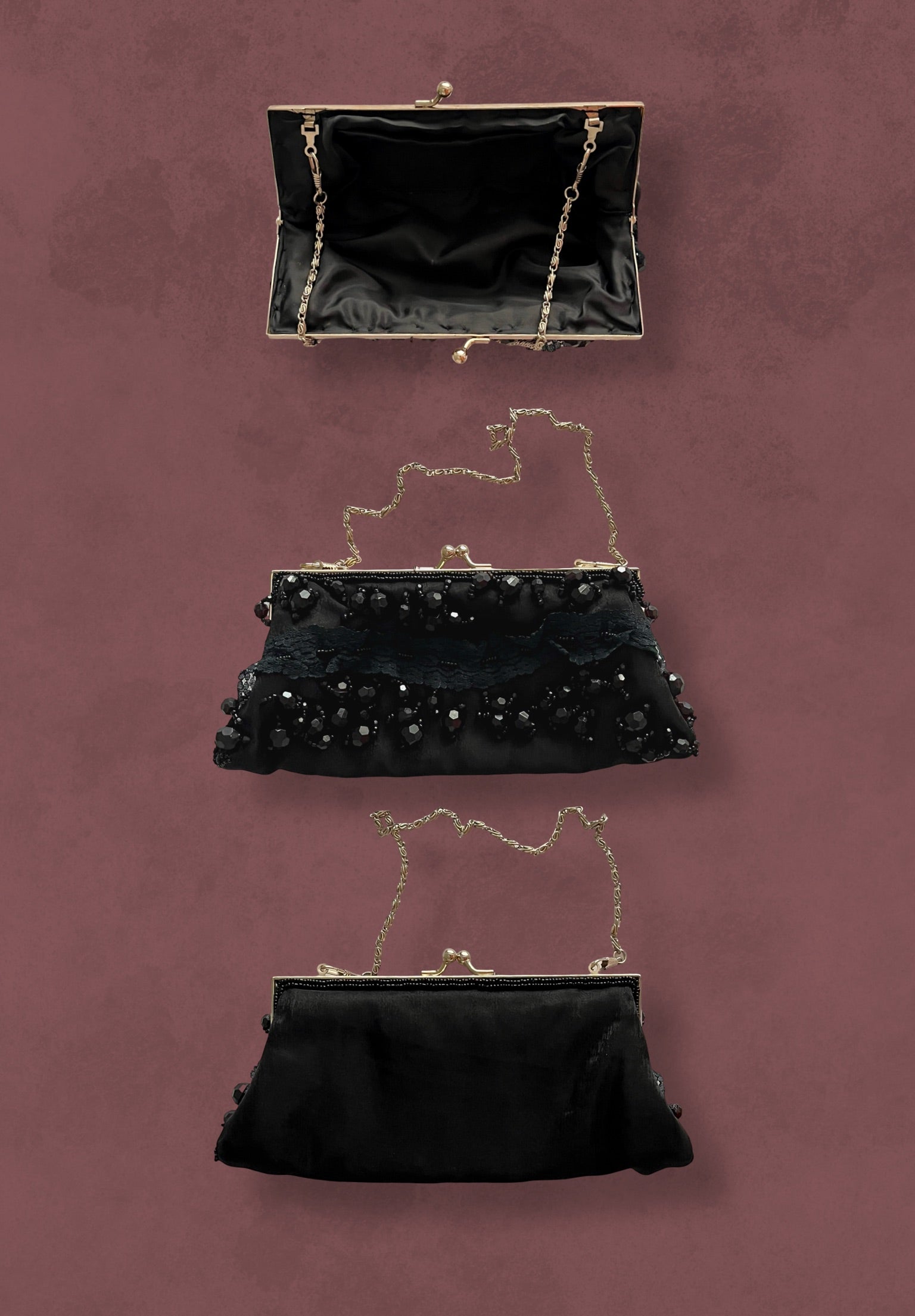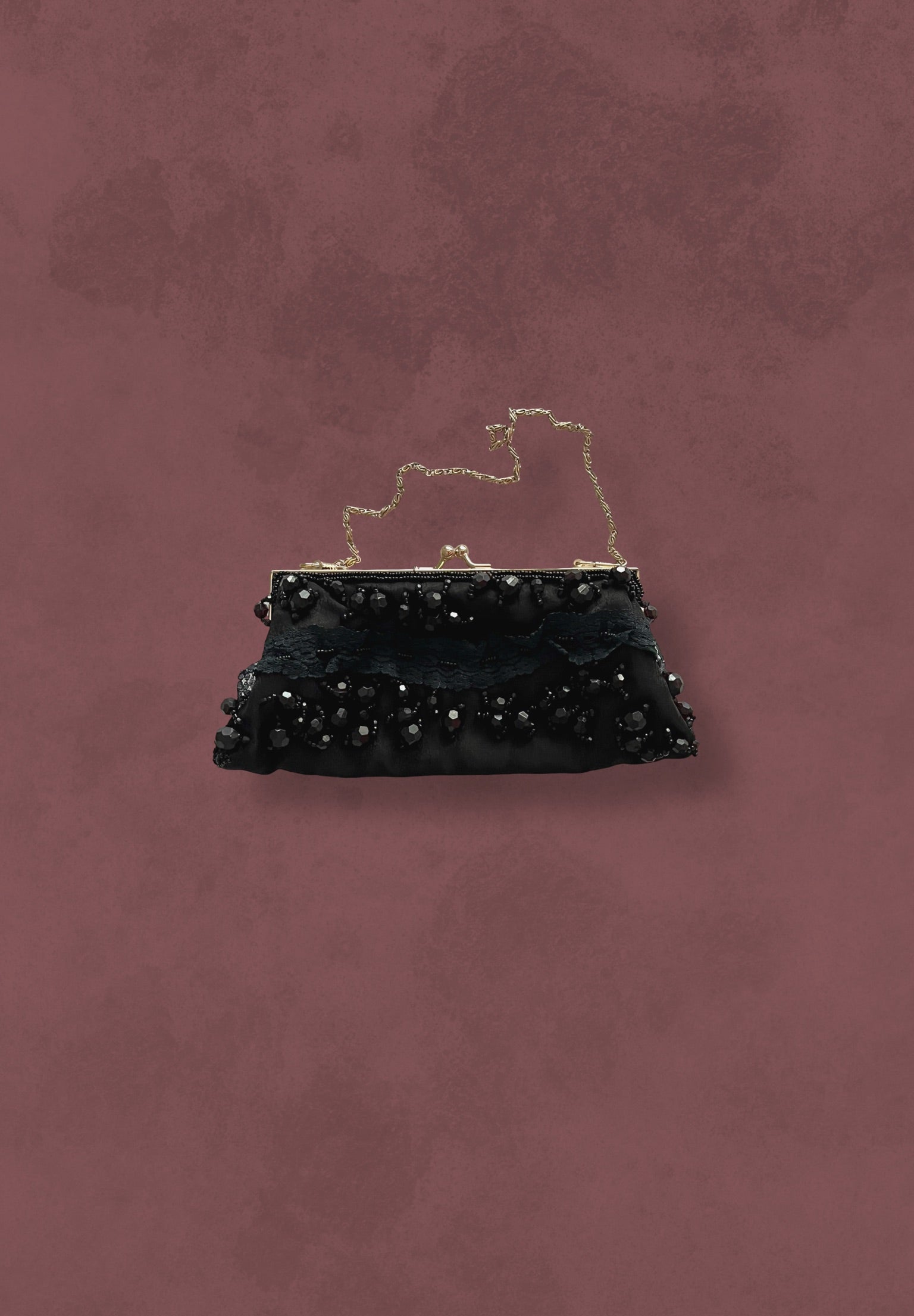 Bolso vintage diseñado con ribete de encaje en el centro y pedrería de tamaños variados. Presenta un marco metálico en acabado plateado.