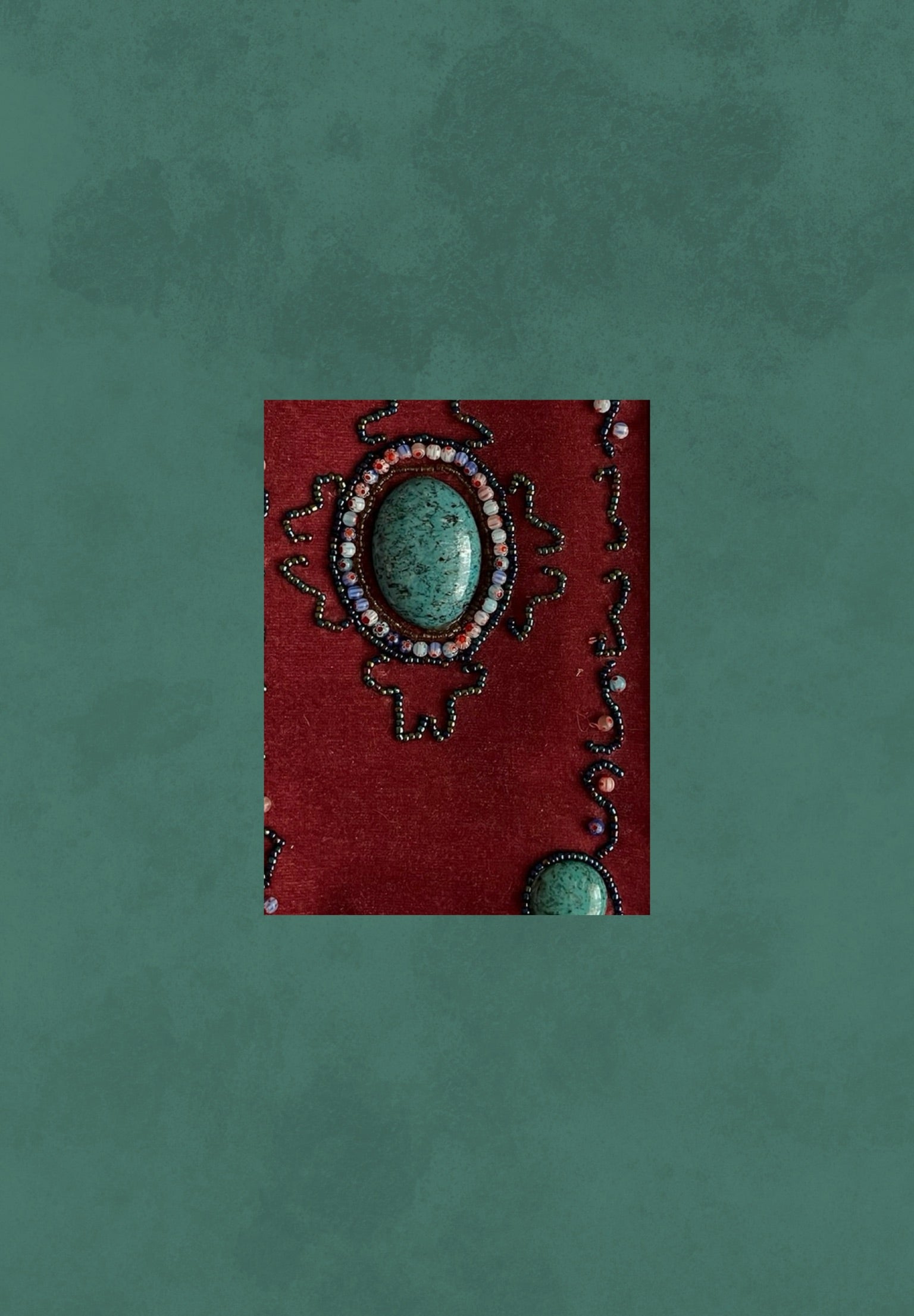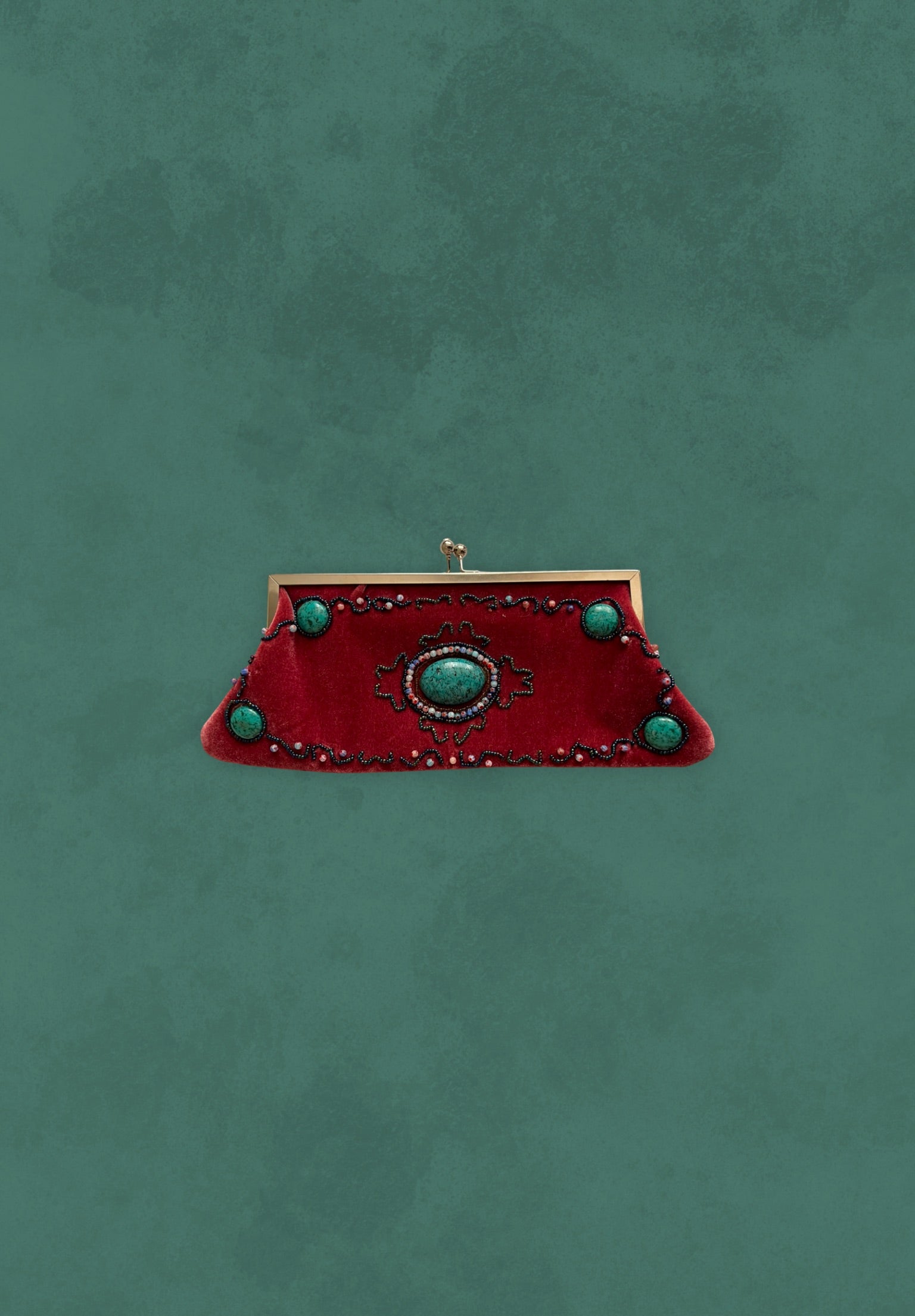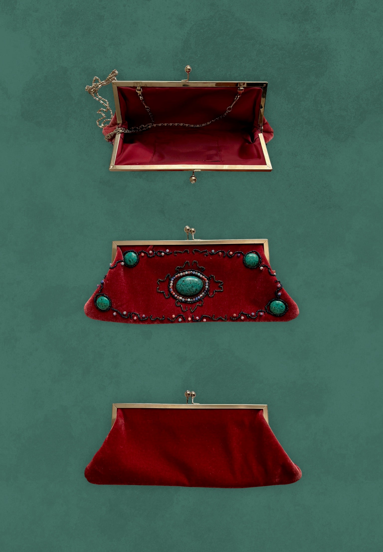 Bolso de mano vintage en terciopelo tono fresón, decorado con cinco piedras turquesa incrustadas y detalles de bordado alrededor. Presenta un marco metálico en acabado plateado y un asa corta realizada a mano con cuentas turquesa a juego.